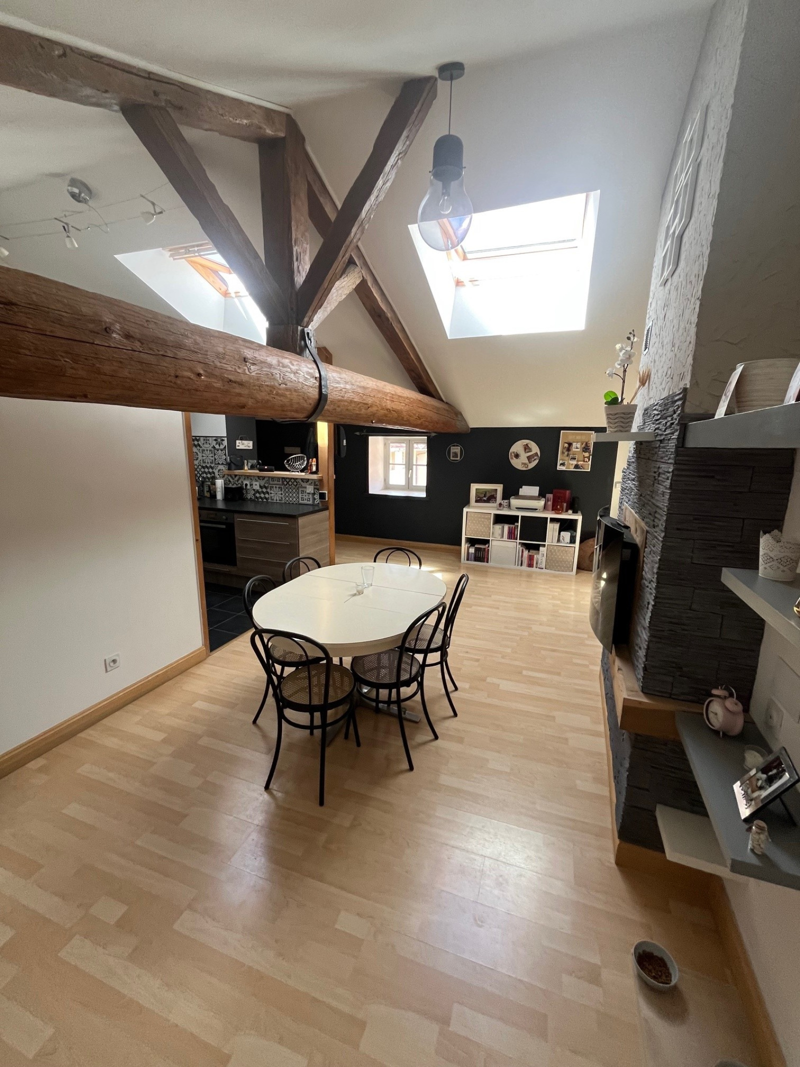 Dans chateau rénové , bel appartement d'une surface habitable de 95 m2 , comprenant entrée, cuisine équipée avec cellier ouverte sur séjour-salon avec de beaux volumes et poutres apparentes, deux chambres, toillettes. Parking privatif.